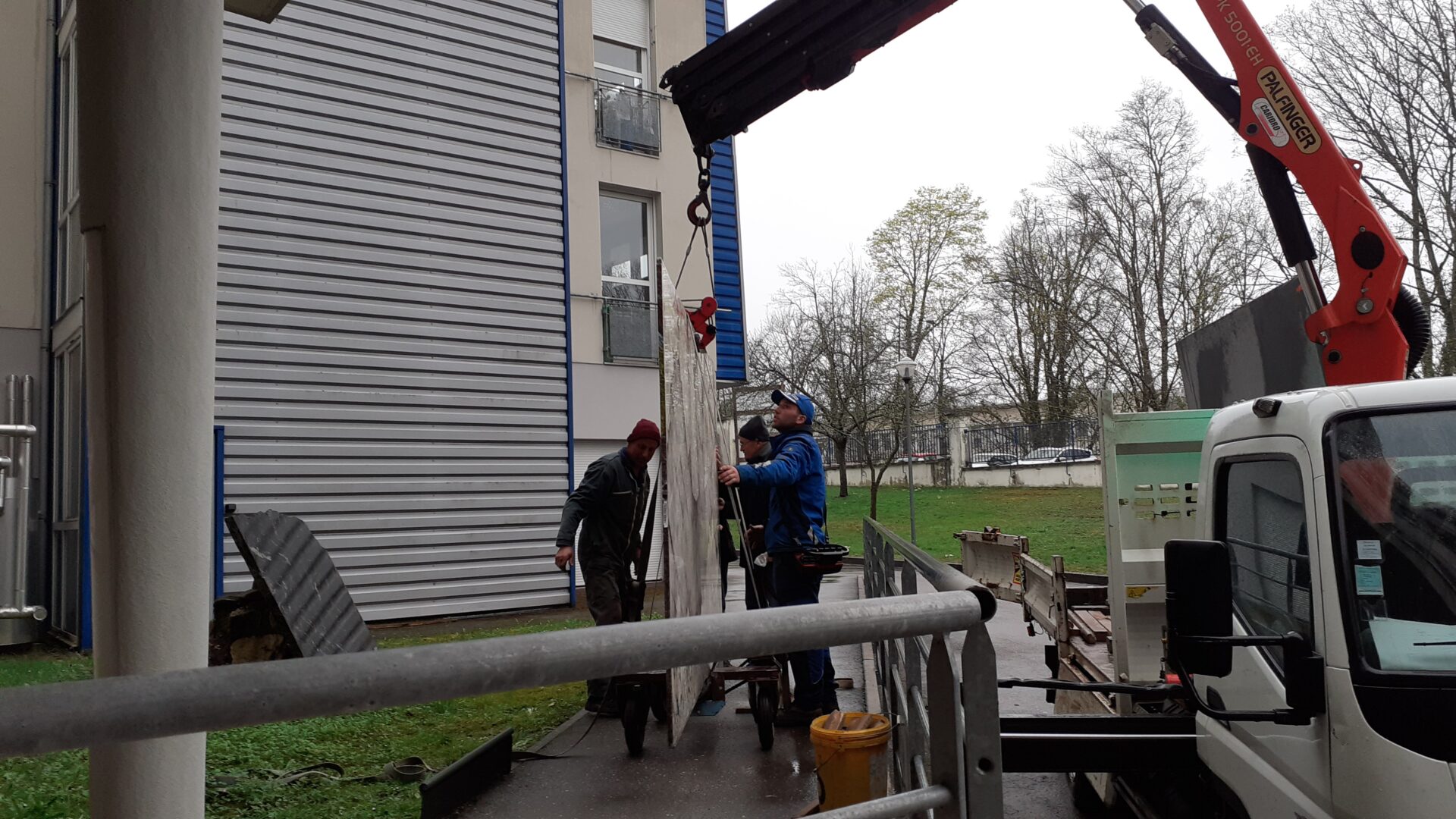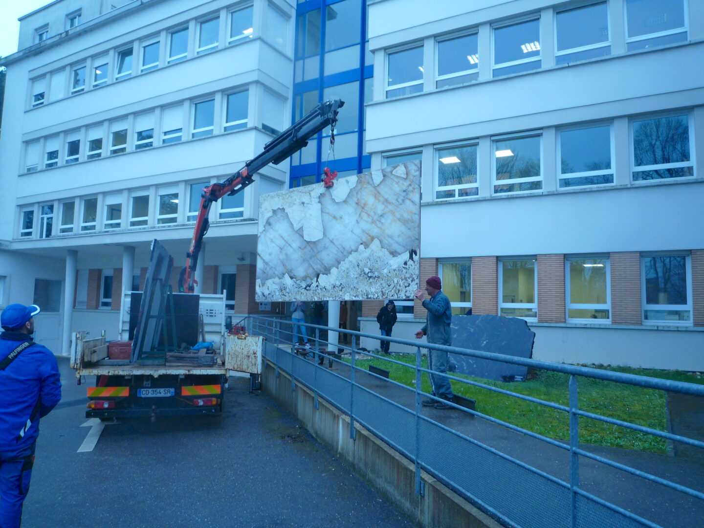 Une plaque de pegmatite originaire du Brésil a été installée le 31 mars 2022, au rez-de-chaussée du CRPG/CNRS (Voir la galerie « Installation de plaque de pegmatite» ; photos J. Guerrier).