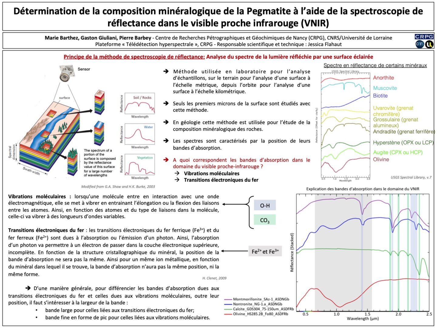 Les spectres obtenus sont alors caractérisés par la position de leurs bandes d’absorption. Dans le domaine du VNIR, ces bandes d’absorption sont le résultat des transitions électroniques du fer ou des vibrations moléculaires.