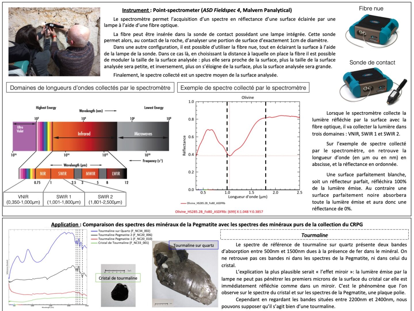 Le spectromètre (ASD Fieldspec 4) permet l’acquisition d’un spectre en réflectance dans le domaine du visible proche infrarouge (VNIR). Ce spectre est le spectre moyen d’une surface éclairée par une lampe, collecté à l’aide d’une fibre optique (Voir le poster de M. Barthez et al. ci-dessous, aussi téléchargeable ici).