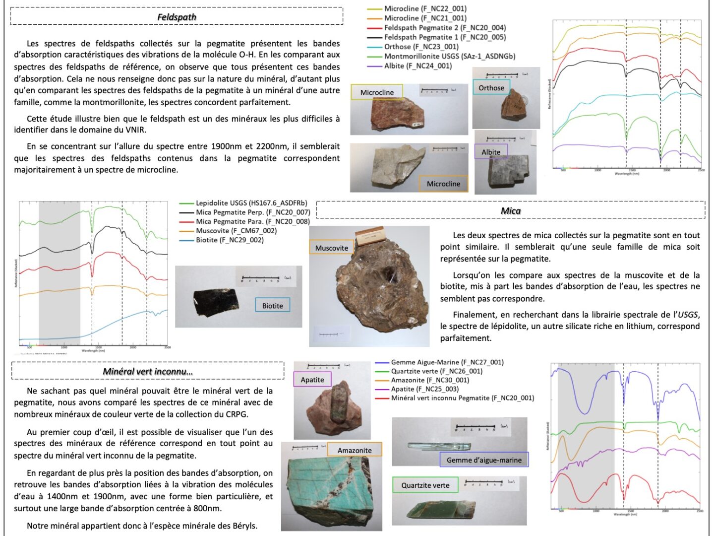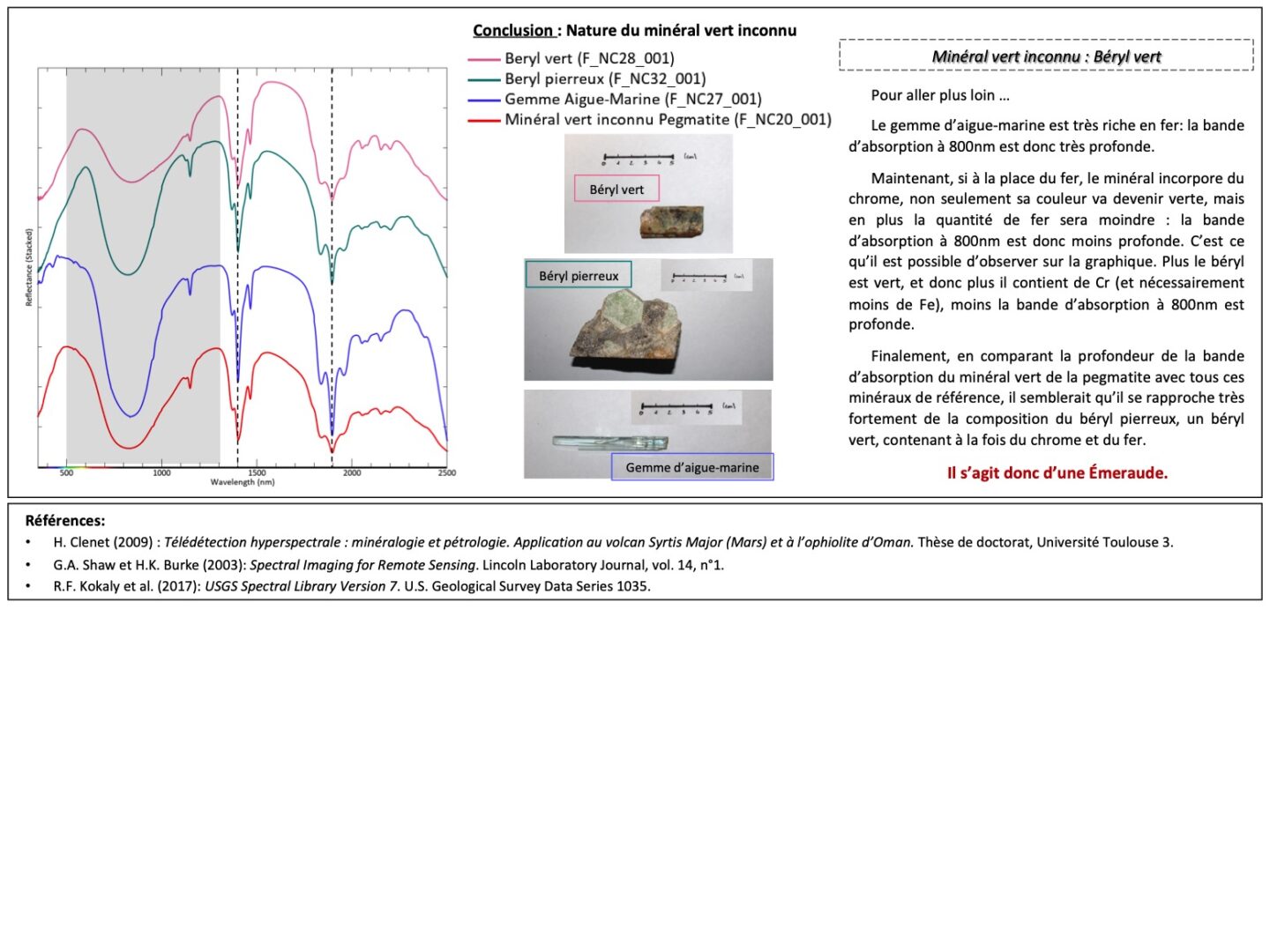L’étude du minéral vert a été réalisée en comparant son spectre VNIR avec des spectres acquis sur des minéraux de la collection de référence du CRPG. Ces minéraux étaient notamment : un cristal d’aigue marine gemme, un béryl pierreux associé à un greisen (association quartz + muscovite), un béryl vert (contenant du chrome), une amazonite (microcline vert) et un quartzite vert. Cette étude a permis d’affirmer que le minéral vert était un béryl vert contenant à la fois du chrome et du fer, similaire à la composition d’une émeraude.