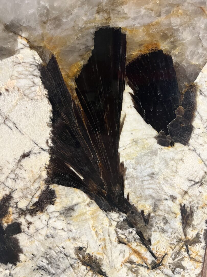 La zonation de la pegmatite est très nette, avec un cœur de quartz gris translucide et une bordure formée de grands cristaux de feldspath potassique automorphes (Fig. 1), perthitiques (feldspath potassique contenant des films et de fines lamelles d’albite) et zonés (Fig. 2), eux-mêmes relayés par une association de feldspath et quartz en texture graphique (Fig. 3 ; interpénétration de grands cristaux de quartz et de feldspath donnant en section des plages anguleuses cunéiformes), accompagnée de biotite (parfois en lamelles disposées en feuilles de livre ouvert ; Fig. 4), tourmaline noire (variété schorlite) et béryl vert (Fig. 5).