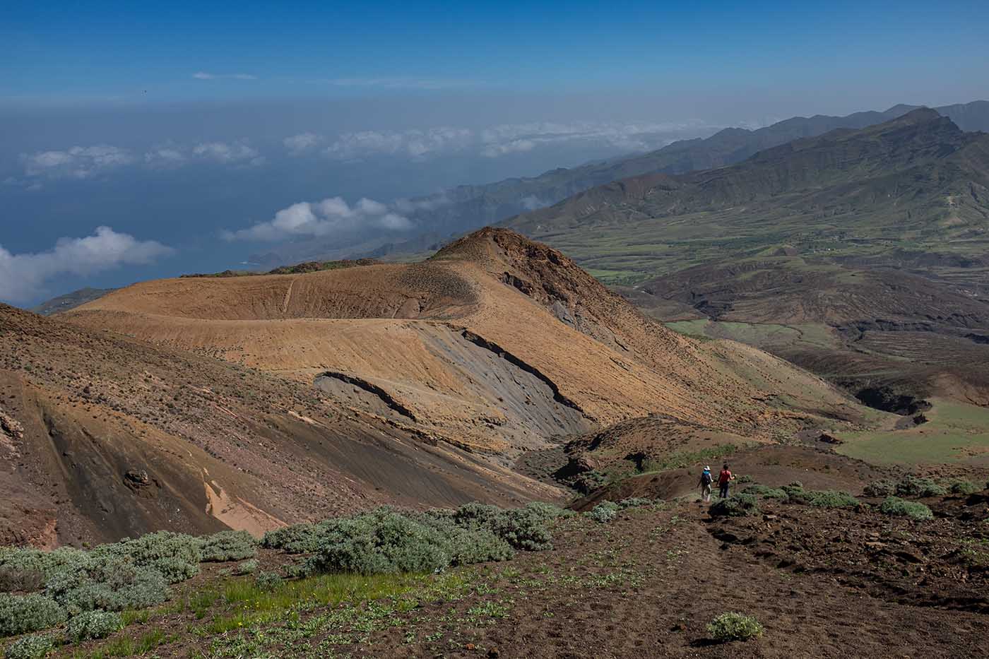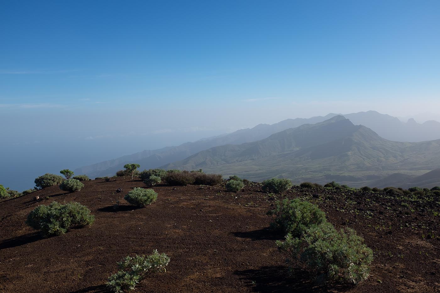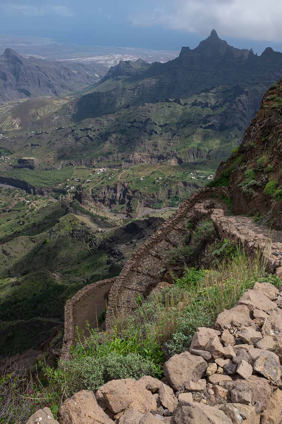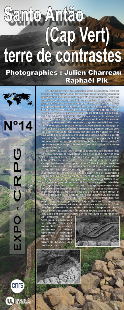 Santo Antao est la deuxième plus grande île de l’archipel. Elle fut découverte par le navigateur Diogo Afonso le 17 janvier 1462 et tire son nom de cette date qui est le jour de la fête de Saint Antoine. Elle est située à l’extrême Nord-ouest de l’archipel et s’est probablement développée depuis 7.6 Ma. Elle est constituée par trois centres volcaniques majeurs avec d’Est en Ouest : Cova, Cha de Morte et Tope de Coroa qui ont produit au cours du temps essentiellement des laves de type néphélites et basanites à phonolites. L’île présente actuellement des reliefs importants avec pour sommet le Topo Da Coroa culminant à 1979 m et un large plateau aux altitudes >1200 m dans sa partie orientale. Elle représente ainsi une barrière orographique majeure qui compartimente fortement les précipitations qui se concentrent essentiellement au NE sur la côte sous le vent (> 1000 mm/yr) et sur le plateau en haute altitude, alors que la partie SO de l’île qui est abritée présente une aridité prononcée. Ceci se traduit par des vallées luxuriantes et propices à l’agriculture au NE contre des vallées extrêmement arides et désertiques sur la pointe SO de l’île.