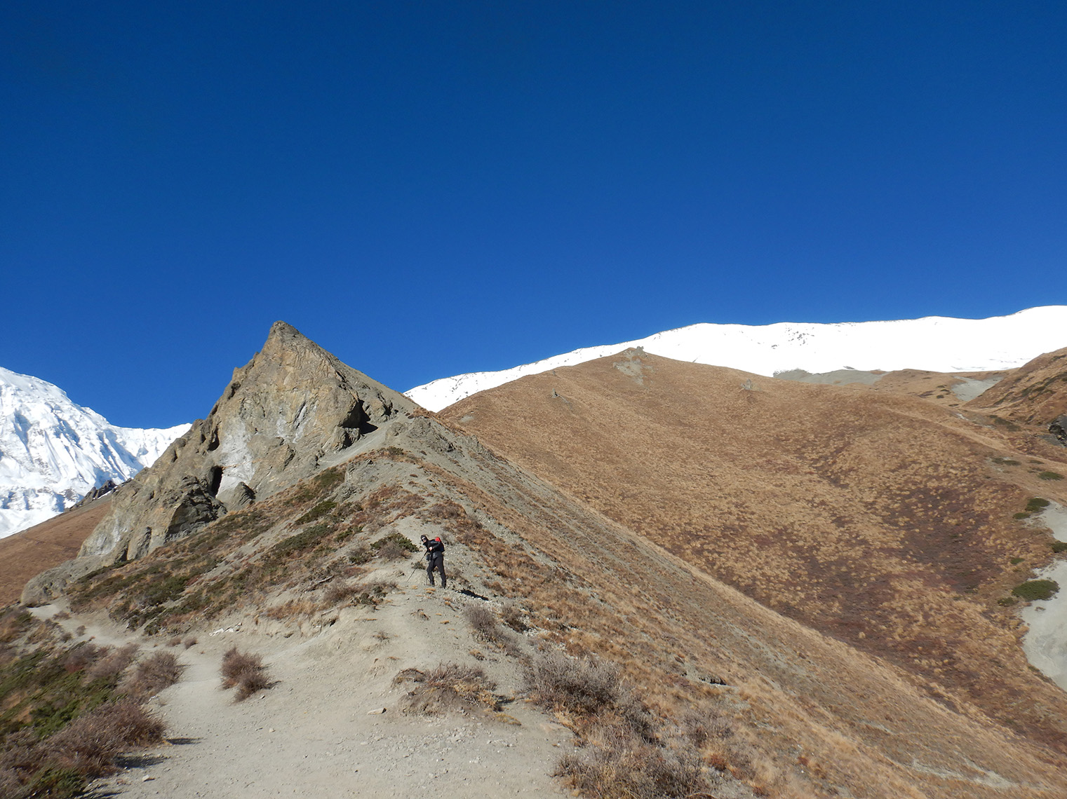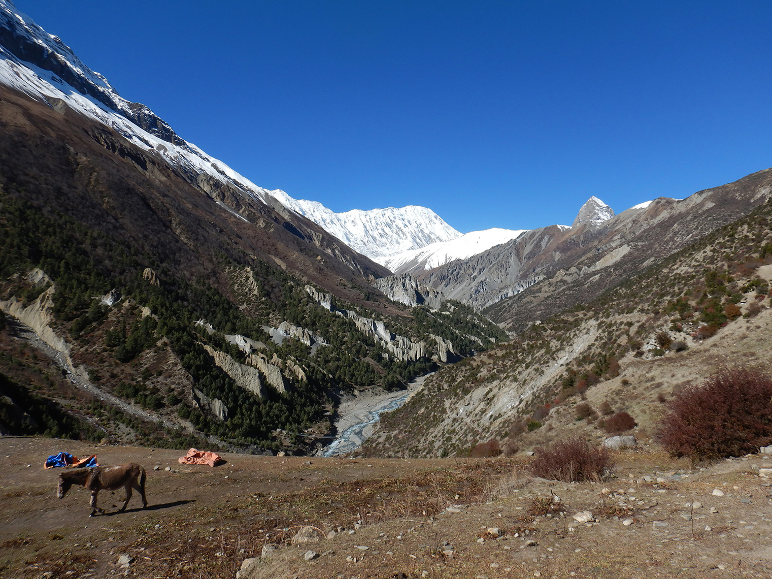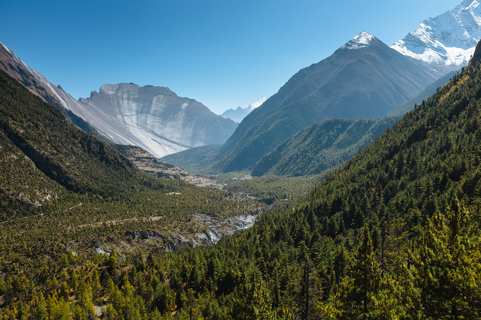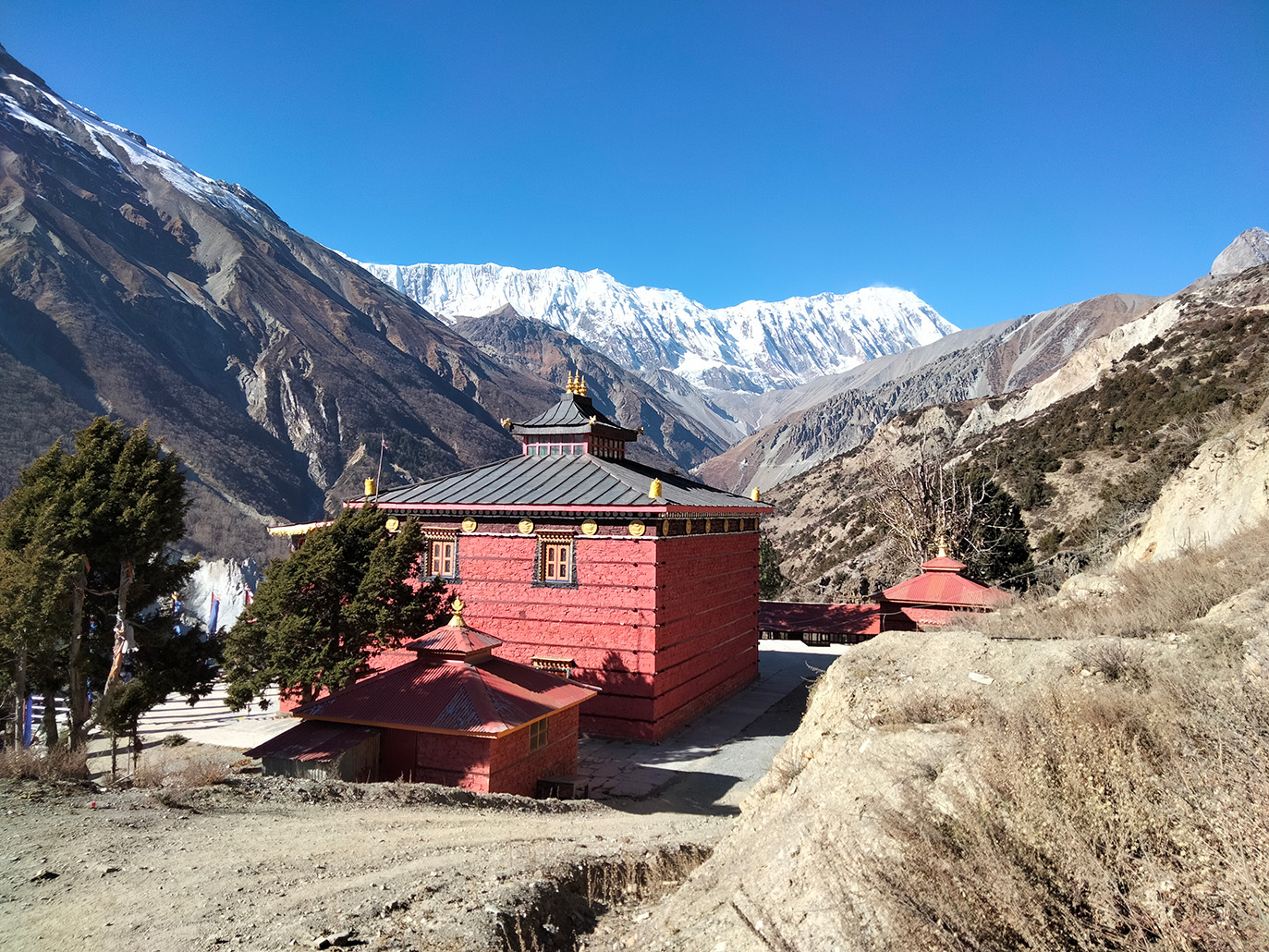 La haute vallée de la Marsyandi, située sur les contreforts septentrionaux du massif des Annapurnas, offre plus particulièrement le témoignage de nombreux dépôts de glissements géants passés imbriqués dans les morphologies glaciaires. Grande vallée ouverte, s’étalant entre 3000 et 4000 mètres d’altitude, elle attire de nombreux touristes avides de dépaysement, de paysages grandioses et de panorama sur les cimes enneigées des Annapurnas qui s’enchainent et forment une muraille quasi continue à plus de 7000 mètres. Points d’orgue de la vallée : le Pisang Bowl à son entrée, gigantesque surface structurale plissée qui s’offre au regard tel un demi-vélodrome incliné ; les villages de Pisang et de Manang, avant-postes du monde tibétain, avec ses maisons en pierre et pisé, et ses troupeaux de yacks ; le col de Thorung La qui permet de basculer sur la vallée de la Kali Gandaki et Muktinath haut lieu de pèlerinage pour les hindouistes ; et enfin le lac de Tilicho, un des plus hauts lacs du monde perché à près de 5000 mètres d’altitude et qui s’est formé au début de l’Holocène à l’arrière d’un barrage formé par un glissement rocheux géant.