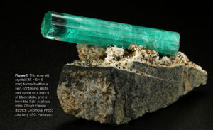 Exceptional mineralogical oddities of gemmological interest have been found in Colombia’s emerald deposits. Their particular sedimentary-hydrothermal geological environment is characterised by large fluid circulations and changes in thermodynamic conditions during emerald precipitation. In this context, various etching processes and growth perturbations affected the crystals in both the eastern and western belts of these emerald deposits. In the eastern belt, variations in post-growth etching are responsible for the formation of ‘vaso’ (cup), ‘spongy’ and spear-shaped emeralds, and etching associated with near-parallel growth of elongated crystals resulted in fibrous emerald specimens. In addition, rare sceptre emeralds formed by epitaxial lateral overgrowth due to the arrival of a later mineralising pulse in the hydrothermal system. ‘Emerald gastropods’ are also found in the eastern belt, and formed by the replacement of fossil aragonite by calcite which later dissolved away and was replaced by emerald. In the western emerald belt, hydrothermal fluid circulation sometimes resulted in non-uniform crystal growth, giving rise to horseshoe-shaped emeralds characterised by an incomplete hexagonal prismatic habit. An unusual sample of a calcitised trapiche emerald—due to fluid circulation affecting trapiche emerald-bearing black shale—is also described.