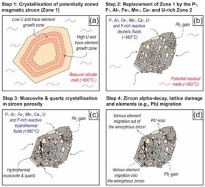 Zircon petrochronology is widely used to quantify the age and duration of magma emplacement and differentiation. However, in highly differentiated magmas, such as those forming rare-metal granites, zircon may form at the magmatic–hydrothermal transition, and its primary crystallisation history, together with its secondary hydrothermal overprint, needs to be resolved and clarified. To resolve zircon formation in such evolved and mineralised granitic systems, we investigated heterogeneous zircons from the Beauvoir rare-metal granite (Massif Central, France). Most of the Beauvoir zircons are characterised by the presence of two distinct domains, designated as Zone 1 and Zone 2. Zone 1 occurs as rounded, Si- and Zr-rich domains, which are embedded in the interconnected Si- and Zr-poor Zone 2 domains that are also extremely P-, U-, F-, Ca-, Fe- and Mn-rich. Both of these zones are strongly damaged (metamict) by radioactive decay, mainly from their high U concentrations. Textures and chemical composition strongly suggest that Zone 1 corresponds to magmatic zircon that has been partly replaced by the Zone 2 material during the magmatic–hydrothermal transition. The crystallisation of Zone 1 zircon is preceded by the crystallisation of U-rich cores (∼6 wt % UO2) containing UO2 (uraninite) micro-inclusions, which are then surrounded by a Zone 1 homogeneous rim. These uraninite micro-inclusions resulted from the uranium migration in the metamict and amorphous precursor zircon. U-Pb dating of single zircon grains using chemical abrasion, isotope dilution thermal ionisation mass spectrometry (CA-ID-TIMS) techniques yielded a well-defined discordia line with an upper intercept at 312±2.9 (7.2) Ma (2σ) and a near-zero-age lower intercept. The discordancy reflects the continuous loss of radiogenic lead from a heavily damaged and aperiodic zircon lattice. On the other hand, ID-TIMS data from magmatic apatite of the Beauvoir granite yielded an age of 313.4±0.2 (1.3) Ma (2σ), so far, the most accurate and precise crystallisation age of the Beauvoir granite. Thus, we emphasise that although the study of zircon from highly differentiated systems provides strong insights into the magmatic–hydrothermal transition of these objects, their metamict nature prevents their use to precisely and accurately date the emplacement of rare-metal granite.