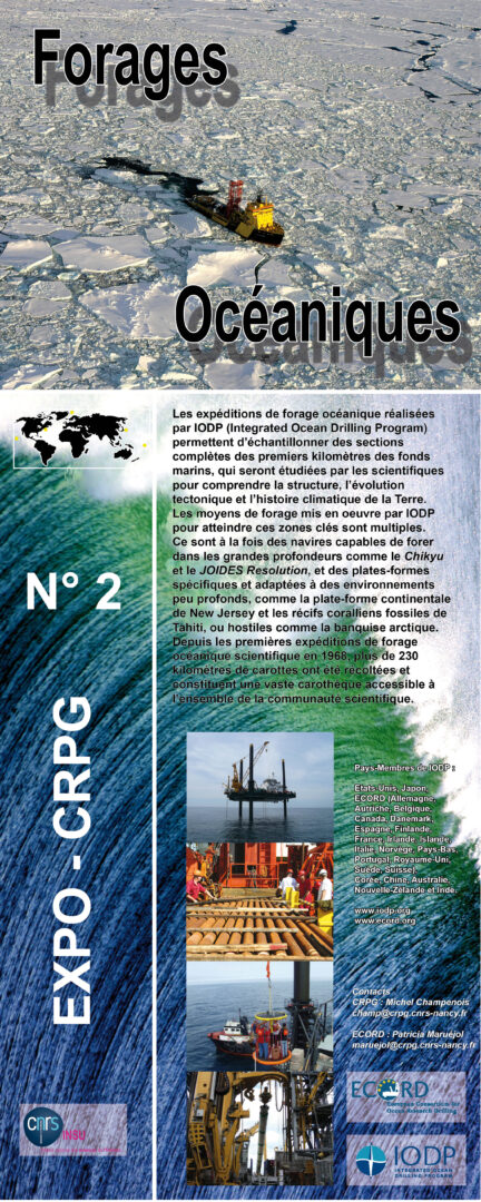 Les expéditions de forage océanique réalisées par IODP (Integrated Ocean Drilling Program) permettent d’échantillonner des sections complètes des premiers kilomètres des fonds marins, qui seront étudiées par les scientifiques pour comprendre la structure, l’évolution tectonique et l’histoire climatique de la Terre. Les moyens de forage mis en oeuvre par IODP pour atteindre ces zones clés sont multiples. Ce sont à la fois des navires capables de forer dans les grandes profondeurs comme le Chikyu et le JOIDES Resolution, et des plates-formes spécifiques et adaptées à des environnements peu profonds, comme la plate-forme continentale de New Jersey et les récifs coralliens fossiles de Tahiti, ou hostiles comme la banquise arctique.