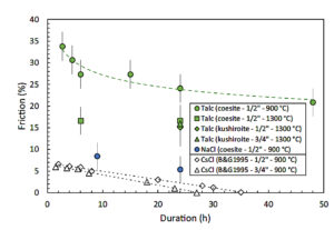 Piston-cylinder assemblies exhibit inhomogeneous pressure distributions and biases compared to the theoretical pressure applied to the hydraulic press because of the thermal and mechanical properties of the assembly components. Whereas these effects can partially be corrected by conventional calibration, systematic quantification of friction values remain very sparse and results vary greatly among previous studies. We performed an experimental study to investigate the behavior of the most common cell assemblies, i.e., talc [Mg3Si4O10(OH)2], NaCl, and BaCO3, during piston-cylinder experiments to estimate the effects of pressure, temperature, run duration, assembly size, and assembly materials on friction values. Our study demonstrates that friction decreases with time and also partially depends on temperature but does not depend on pressure. We determined that friction decreases from 24 to 17% as temperature increases from 900 to 1300 °C when using talc cells, indicating a friction decrease of ~2% per 100 °C increase for 24 h experiments. In contrast, friction becomes independent of time above 1300 °C. Moreover, at a fixed temperature of 900 °C, friction decreases from 29% in 6 h runs to 21% in 48 h runs, corresponding to a decrease of friction of 0.2% per hour. Similar results obtained with NaCl cell assemblies suggest that friction is constant within error, from 8% in 9 h runs to 5% in 24 h runs. At 900 °C, possible steady-state friction values are only reached after at least 48 h, indicating that friction should be considered a variable for shorter experiments. We establish that assembly materials (and their associated thermomechanical properties) influence the friction correction more than the dimensions of the assembly parts. Finally, we show that the use of polytetrafluoroethylene film instead of conventional Pb foil does not modify friction but significantly reduces the force required for sample extraction, thus increasing the lifetime of the carbide core, which in turn enhances experimental reproducibility