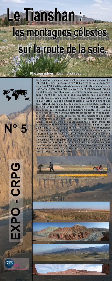 Il est traversé par plusieurs itinéraires commerciaux anciens, appartenant à la route de la soie, qui ont permis l’exportation des étoffes chinoises vers l’Occident. Il appartient aujourd’hui à la plus vaste province politique chinoise : le Xinjiang, une région aux fortes diversités culturelles et ethniques. La chaîne actuelle est en grande partie liée à la collision entre l’Inde et l’Asie qui, au Cénozoïque, a réactivé les anciennes structures et rajeuni sa topographie. Aujourd’hui terre de toutes les attentions pour ses richesses minières et pétrolières, les montagnes célestes accommodent jusqu’à 40% du raccourcissement entre l’Inde et l’Asie et représentent donc aussi une zone clé pour l’étude des processus fondamentaux liés à cette collision majeure. Situé dans la zone la plus intracontinentale du monde, le Tianshan est également bordé par deux grands bassins sédimentaires qui offrent ainsi des archives précieuses pour l’étude des changements climatiques passés. C’est pourquoi, depuis quelques années, le CRPG a porté son regard sur cette région particulière dans le but de mieux contraindre les vitesses de déformation depuis plusieurs millions d’années mais également dans celui de contraindre l’évolution de taux d’érosions il y a 2-4 Ma lors de l’installation des cycles glaciaires sur Terre.