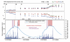 Figure 2: Exemples de séries temporelles issues de la corrélation d’images PAZ et TSX, inversées dans la direction horizontale de la pente et la direction verticale pour trois pixels localisés sur le glissement de Mathilo (Centre Népal), et comparaison avec les précipitations et un modèle de hauteur de nappe (Thèse de Master de Florian Leder, http://dx.doi.org/10.2139/ssrn.5399352).
