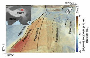Un premier axe de recherche est consacré à l’étude du pergélisol du plateau Tibétain et des dynamiques de versant associées. Les cycles gel/dégel induisent des déplacements mesurables par interférométrie radar (InSAR, Figure 1). Ces travaux (e.g. https://doi.org/10.1002/2016GL070781, https://doi.org/10.1016/j.epsl.2020.116404) ont révélé des vitesses de subsidence du sol de plusieurs mm/an, signes d’une dégradation active du pergélisol. Dans les zones en pente, les transferts de matière par solifluxion atteignent des vitesses allant jusqu’à plusieurs cm/an (https://doi.org/10.1016/j.rse.2025.114926). Ces dynamiques de versant semblent s’accélérer depuis une à deux décennies, à des rythmes supérieurs aux taux d’érosion obtenus par des datations cosmochimiques. L’objectif du projet est de déterminer si ces processus sont récents et liés au réchauffement climatique, ou s’ils reflètent une dynamique pérenne jusque-là non documentée. Ce projet est mené en collaboration avec Jérôme Lavé (CRPG), Marie-Pierre Doin (ISTerre), et porté par Hugo Watine (doctorant au CRPG), avec le soutien d’une bourse OTELo, d’un projet INSU-PNTS et d’une bourse doctorale CNES.