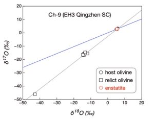 The recent discovery in ordinary chondrites of a population of small, sub-TFL (i.e., negative Δ17O; TFL = Terrestrial Fractionation Line) chondrules isotopically similar to relict grains in larger chondrules offered a glimpse into the sub-TFL precursors of inner disk chondrules. This prompts a search for similar relicts and small chondrules in enstatite chondrites (EC; here the EH3 Sahara 97096, Qingzhen, Caleta el Cobre 025, NWA 14425, and the EL3-an NWA 8785). Our SIMS oxygen isotopic analyses reveal that most olivine grains in E3 chondrites are isotopically indistinguishable from enstatite and must have crystallized during the same thermal event. Yet one analyzed chondrule contains relict olivine grains, one isotopically similar to refractory inclusions (a first in EC) and others with Δ17O values ranging from −9.5 to −7.7 ‰. The latter, and similar discoveries in the literature, must have derived from preexisting chondrules. Small porphyritic chondrules or isolated pyroxene grains tend to be 16O-enriched (and more reduced), as in ordinary chondrites, but their Δ17O never goes below –2 ‰. Cryptocrystalline chondrules found in Sahara 97096 do extend to −7.3 ‰, but are olivine-free. This thus provides evidence for sub-TFL reservoirs ancestral to the E reservoir, although more than one may have existed.