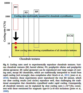 Barred olivine (BO) chondrules are small ferromagnesian silicate igneous droplets with unique dendritic textures that are considered to have formed in the early solar system during one or more brief high-temperature episodes, followed by rapid cooling in a gas. Rapid cooling rates of 100–7200 ◦C/h during chondrule formation have been proposed based on experiments attempting to reproduce BO crystal textures. However, the BO texture has never truly been reproduced under such rapid cooling conditions. Here, we experimentally show that true BO textures can be produced either after rapid cooling (>50 ◦C/h) following by reheating step or by cooling rates slower than 10 ◦C/h. Regardless of the thermal history considered, the chemical compositions of glass inclusions trapped within olivines of BO chondrules imply a final slow cooling rate one to two orders of magnitude below previous estimates. Such slow cooling rates are consistent with those estimated for plagioclase-bearing porphyritic chondrules and magmatic type-B Ca-Al-rich inclusions, suggesting that slow cooling rates are common to all similar chondritic objects.
