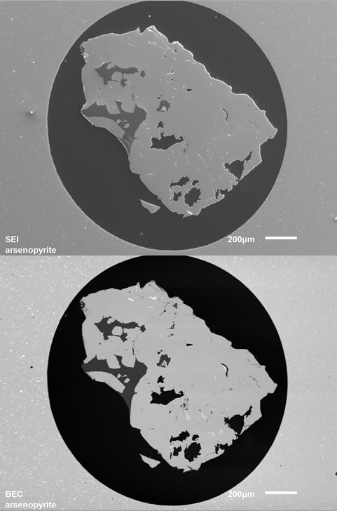This mineral contains some darker phases visible using BSE (SiO2). These phases should be avoided and selected areas for analysis restricted to the main matrix.