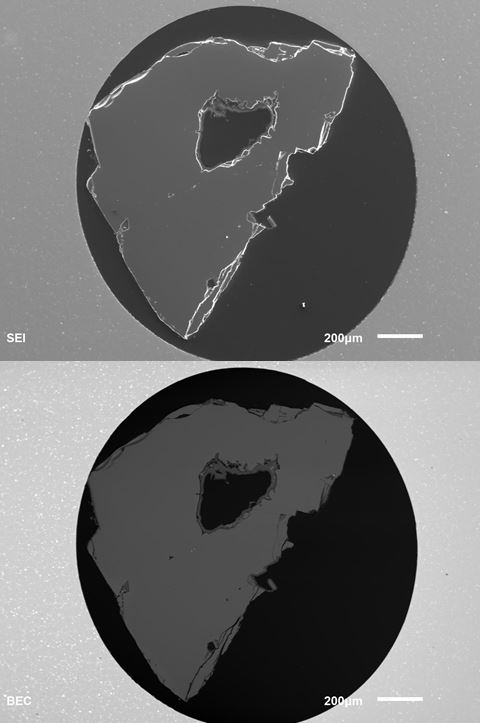 Homogeneous. The edge of the sample shows some alteration features and should be avoided for analyses.