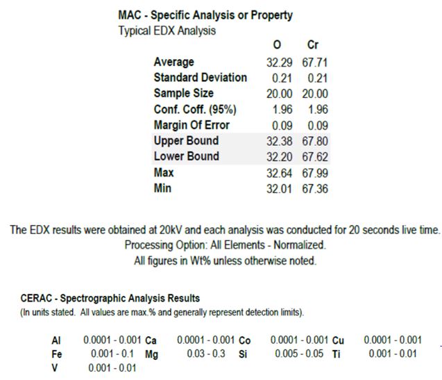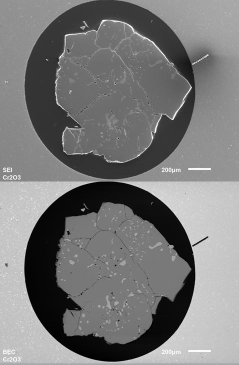 The Cr2O3 used to prepare this standard is derived from fused material. As a result some blebs of chromium oxide glass do occur and these are shown as pale grey areas under the S.E.M. The darker patches seen are crystallised Cr2O3 and analysis should be confined to these areas.