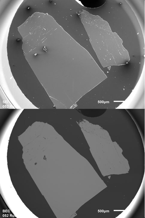 2 pieces, one with a big inclusion (SiO2, zircon, FeO, …)
