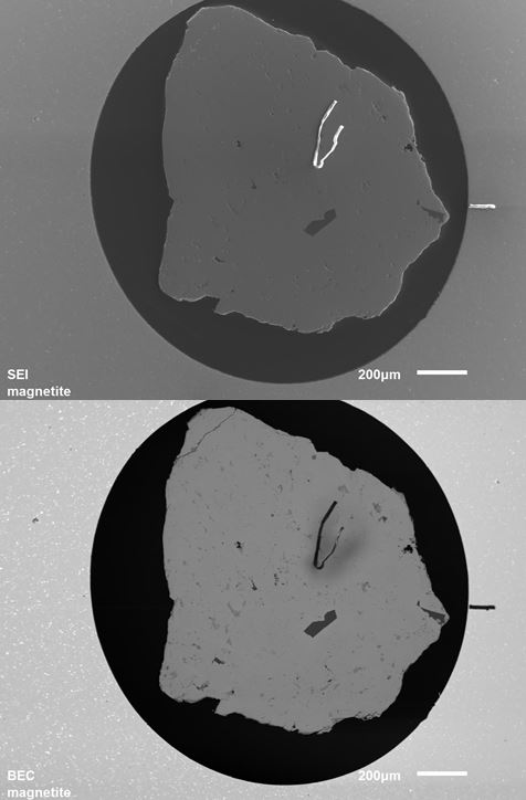 At higher magnification, two phases can be seen in this mineral using BSE. The darker phases should be avoided.