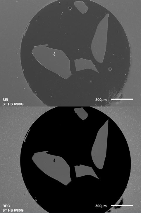 Mostly homogeneous. Top (smaller) grain appears different in composition (cf. ST Hs 6/80-2 in Table)