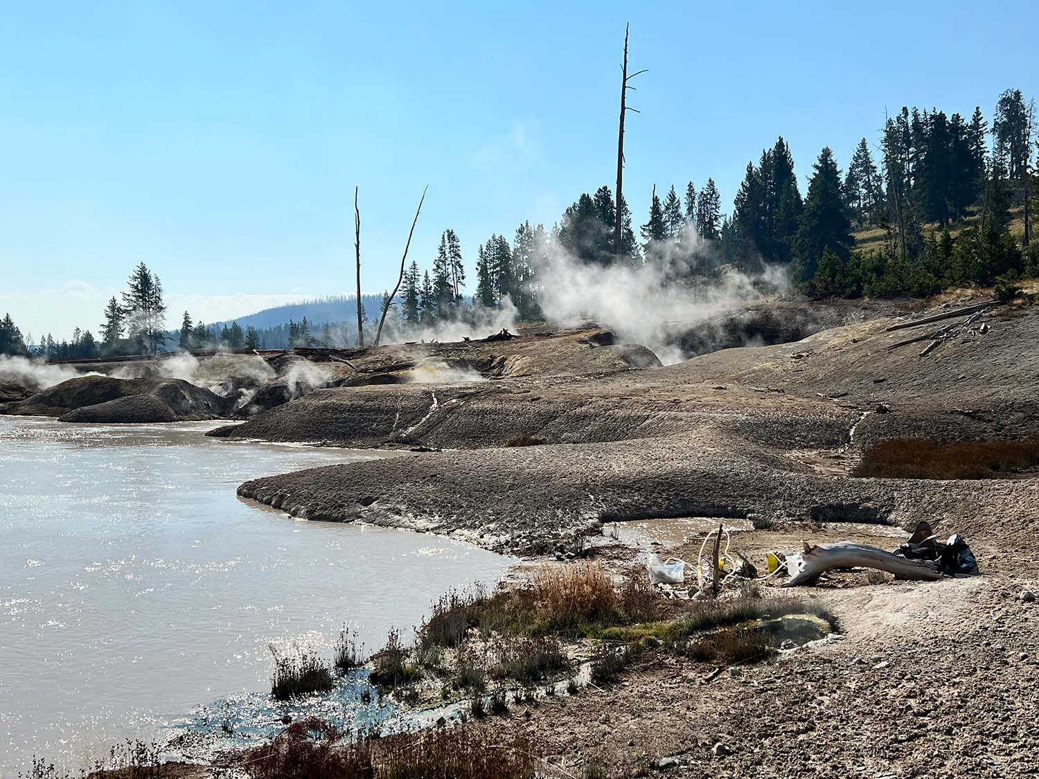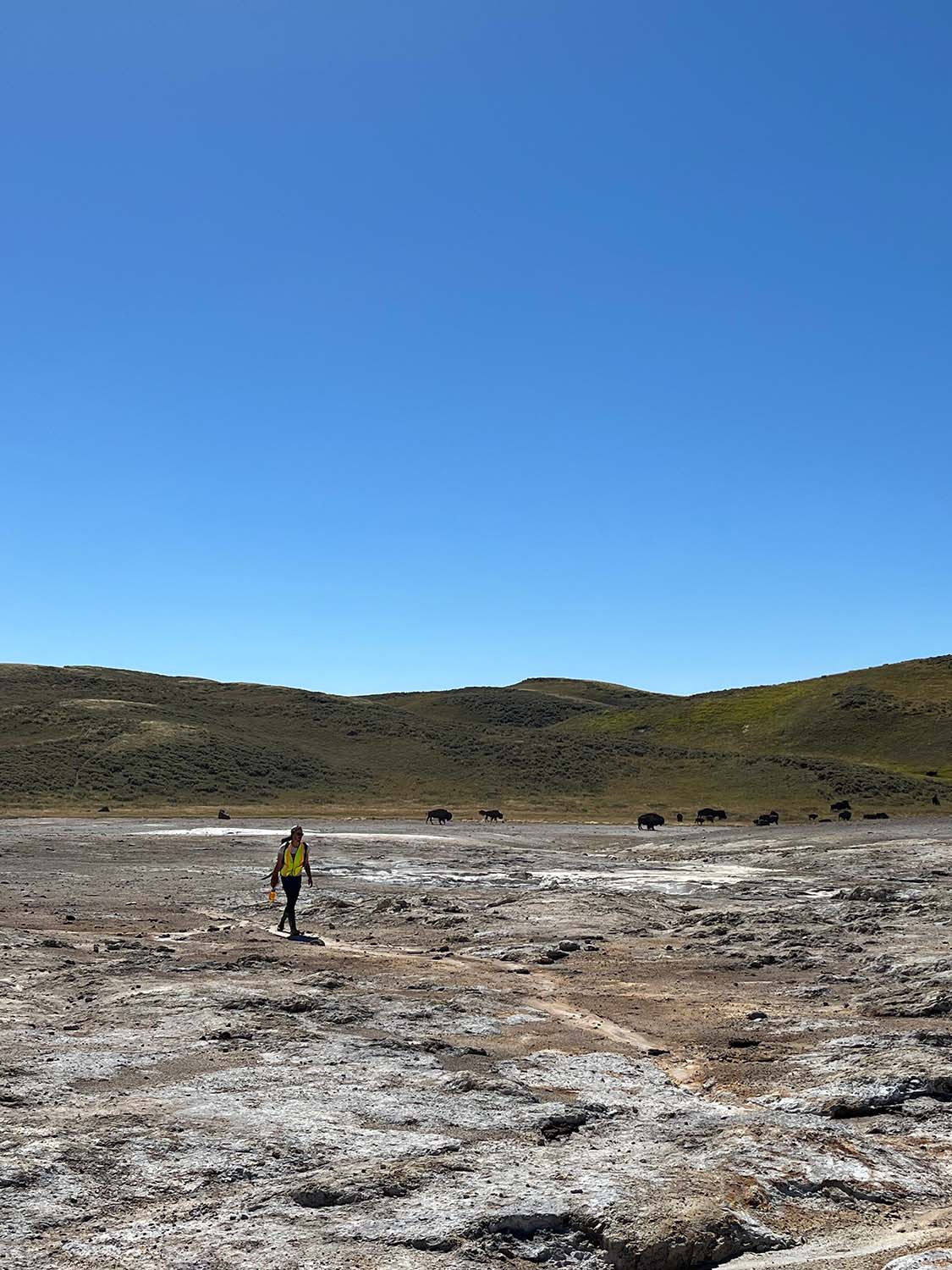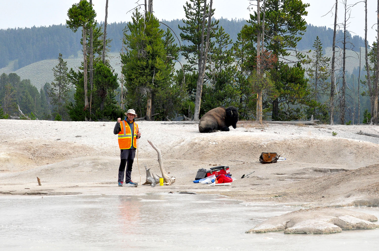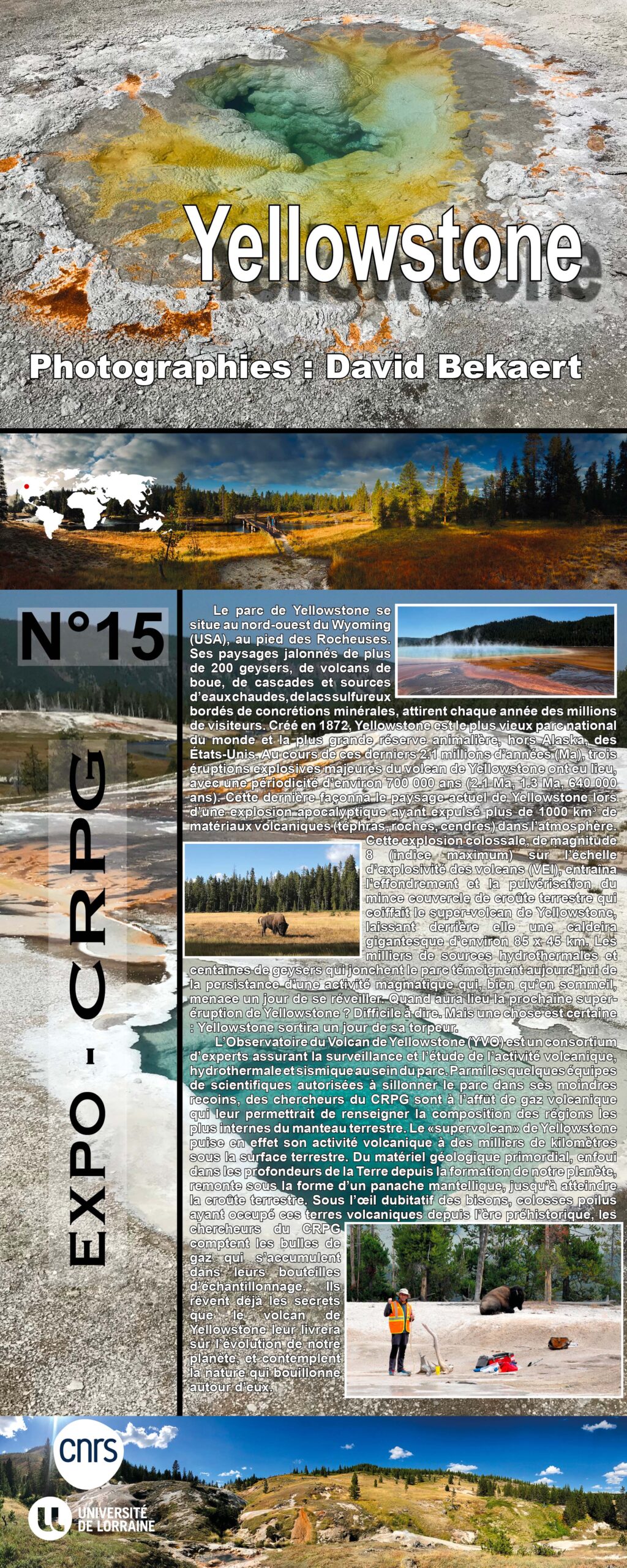 L’Observatoire du Volcan de Yellowstone (YVO) est un consortium d’experts assurant la surveillance et l’étude de l’activité volcanique, hydrothermale et sismique au sein du parc. Parmi les quelques équipes de scientifiques autorisées à sillonner le parc dans ses moindres recoins, des chercheurs du CRPG sont à l’affût de gaz volcanique qui leur permettrait de renseigner la composition des régions les plus internes du manteau terrestre. Le «supervolcan» de Yellowstone puise en effet son activité volcanique à des milliers de kilomètres sous la surface terrestre. Du matériel géologique primordial, enfoui dans les profondeurs de la Terre depuis la formation de notre planète, remonte sous la forme d’un panache mantellique, jusqu’à atteindre la croûte terrestre. Sous l’œil dubitatif des bisons, colosses poilus ayant occupé ces terres volcaniques depuis l’ère préhistorique, les chercheurs du CRPG comptent les bulles de gaz qui s’accumulent dans leurs bouteilles d’échantillonnage. Ils rêvent déjà les secrets que le volcan de Yellowstone leur livrera sur l’évolution de notre planète, et contemplent la nature qui bouillonne autour d’eux.